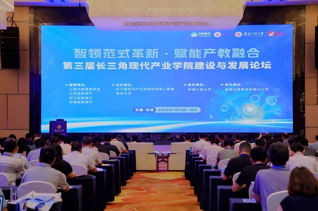 2025年7月16-18日,由长三角现代产业学院协同育人联盟、常州大学主办,安徽工程大学承办的第三届长三角现代产业学院建设与发展论坛在安徽芜湖举行,来自全国100余所高校及企事业单位代表300余人参加会议,本次论坛的主题为“智领范式革新·赋能产教融合”。安徽省委教育工委委员、省教育厅副厅长刘业勋,芜湖市政协党组副书记、副主席陆雷,安徽工程大学党委副书记、校长黄友锐到会并致辞。我校教务管理部负责人带队参加了论坛。