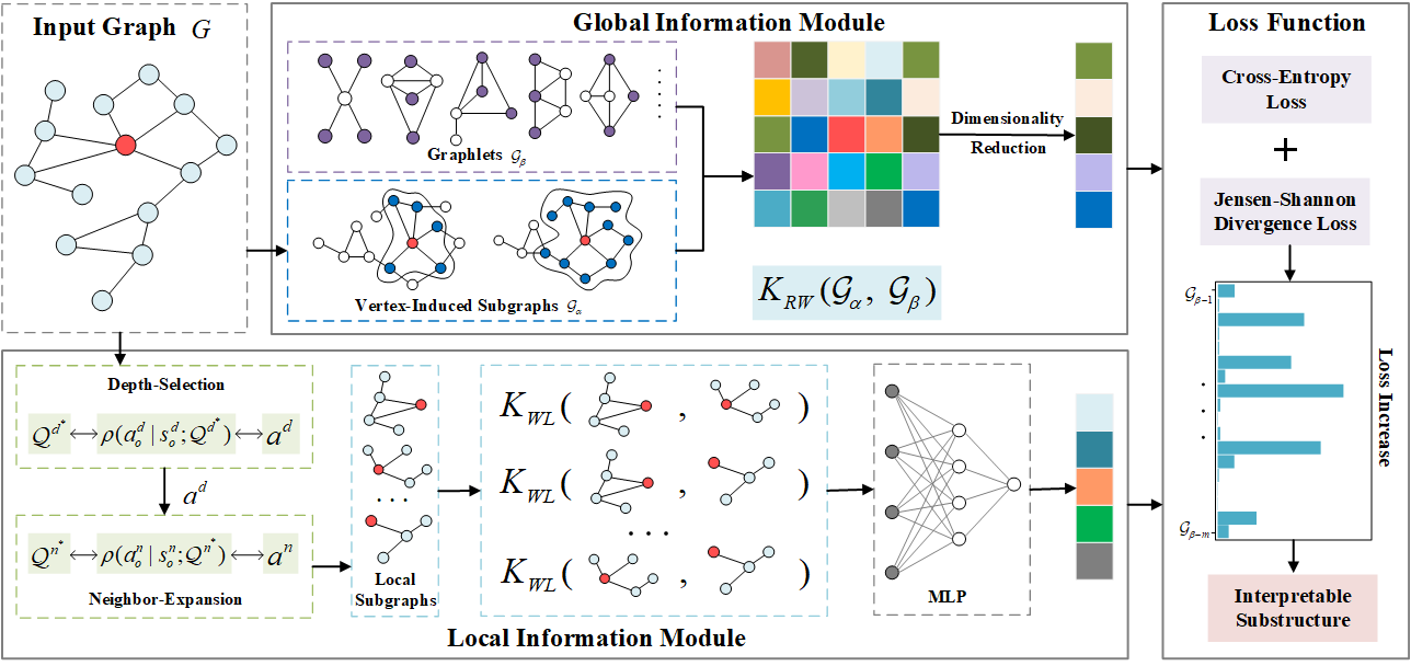 图神经网络(GNNs)已广泛应用于生物化学分子分类、社交网络分析、电路设计预测等多个领域,凭借其强大的特征学习能力在图数据分类任务中展现出显著优势。但长期以来,GNN 模型存在“黑箱”问题—难以建立输出结果与输入图中特定特征、结构模式的直接关联,缺乏可解释的预测依据,这一核心挑战严重限制了其在药物研发、医疗诊断等关键场景的可靠应用。现有方法或缺乏直接可解释的结构载体,或难以同时兼顾全局拓扑信息与局部结构细节,无法满足实际应用对模型透明度的需求。